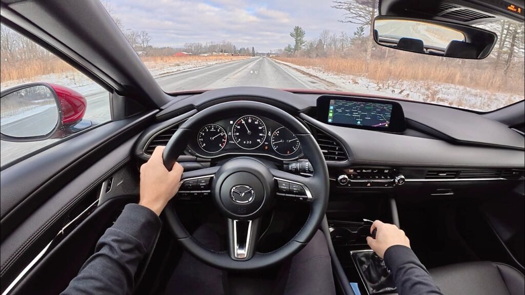 The Mazda 3 handles like a sports car. Steering is precise. It weighs nicely. Body roll is low. Suspension absorbs bumps well. But firm on rough roads. In cities like Chicago, it rides smooth. On highways, it stays stable. Up to 80 mph no drama. G-Vectoring Control helps corners. It shifts torque for better grip. Brakes are strong. Discs all around. ABS works quick. AWD adds traction in snow. Like in Cleveland winters. The car feels engaging. Better than boring rivals. Manual on hatch adds fun. But auto is smooth too. NVH is low. Cabin stays quiet. Overall, a joy on twisty roads.